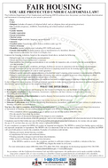 California fair housing posters are designed to inform employees, tenants, and the general public about their rights under California law. Under the Fair Employment and Housing Act (FEHA), those seeking housing are protected from illegal discrimination and harassment. This means that your race, religion, gender, and marital status, among other things, cannot be taken into account when landlords and property management companies are trying to sell, rent, or lease housing. These posters provide detailed information about California fair housing laws, outlining the various protections afforded to individuals. Plus, in addition to explaining your rights, our California fair housing posters detail how to file a complaint with the Civil Rights Department.