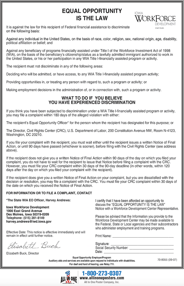 With the All In One Poster Company Compliance program, our team will monitor changes in labor laws for you. Subscribers will receive replacement posters whenever mandatory updates occur. Changes may happen multiple times per year, annually, or less frequently, depending on state or federal requirements. The very nature of these changes is quite unpredictable, except for a few that have yearly cycles, such as minimum wage increases in certain states.